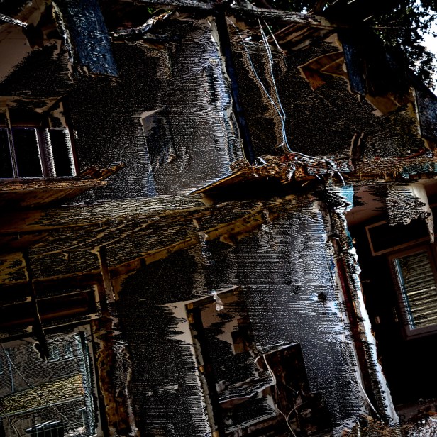Besonders so alte Häuser sind sehr beseelt finde ich. Kein Wunder, wenn man bedenkt, mit wieviel Leben sie gefüllt wurden. Traurig, wenn so ein Haus abgerissen wird. Ich finde deine Verfremdung sehr gelungen und sie gibt es gut wieder. Wie zerrissen sieht das Haus aus.