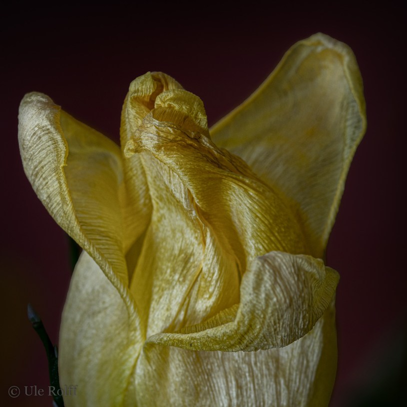 Für die Tulpenblüte selbst gelten die Angaben in der Bildunterschrift. Das Foto habe ich noch ein zweites Mal aufgenommen, dabei Blende 4,5 gewählt und 1/20 sec belichtet. Dadurch wurde alles viel dunkler. Den dunklen, unscharfen Hintergrund aus diesem Bild habe ich unter das Tulpenfoto mit der größeren Schärfentiefe gelegt. Voilà – so lassen sich kontaktarme Tage gut ertragen. (Nicht dass dieses Aktion den kompletten Tag gebraucht hätte 😉  . Ein bisschen was im kalten, sonnigen Garten habe ich auch noch getan.)
