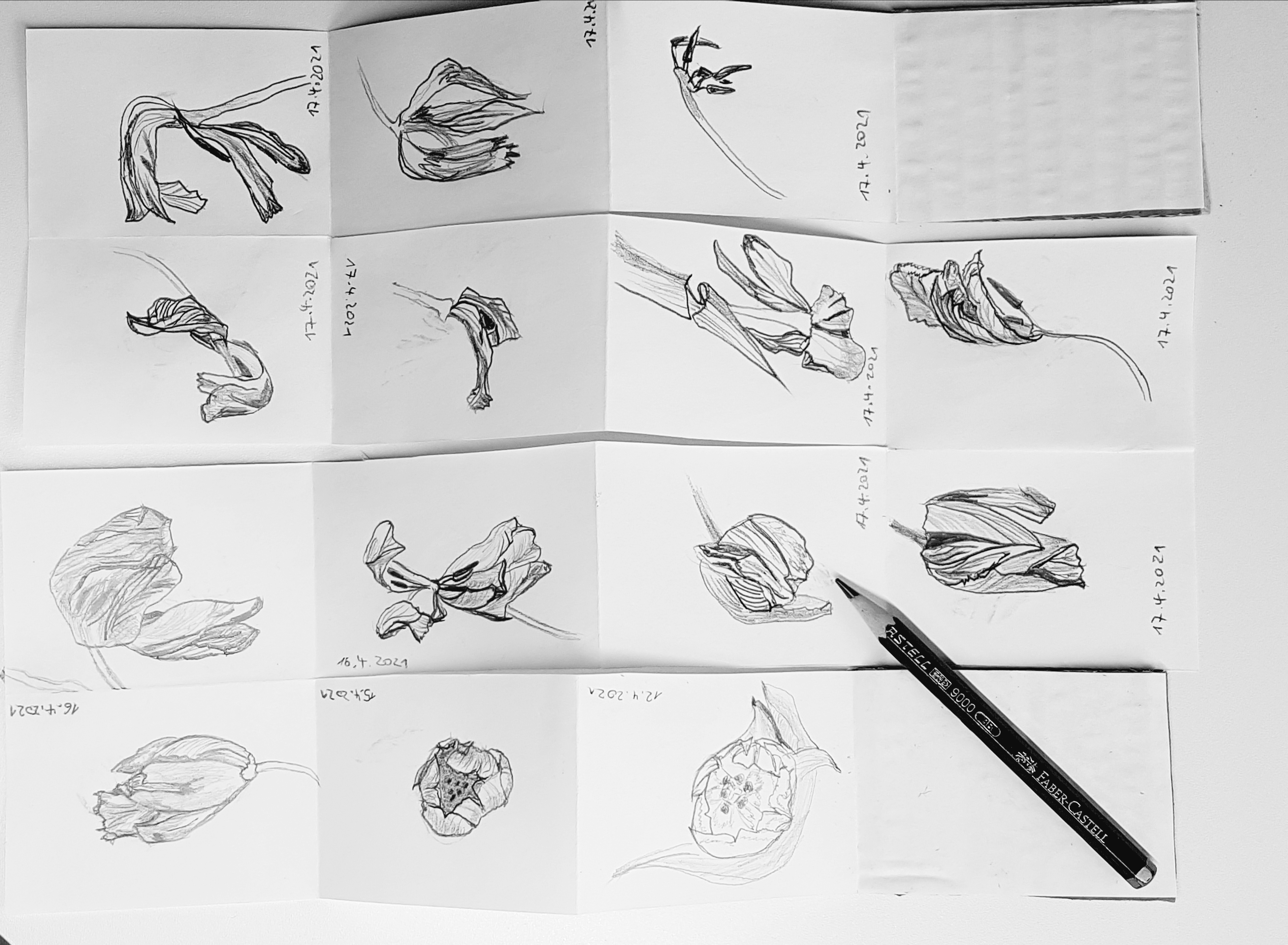 I’m about to learn how much peaceful joy and immersion (and study progress) it gives me to draw the same subject over and over again. Not really the same individual, there was a bunch of tulips, and every single blossom aged in its own way. Yes, it feels great, and I’ll do it again 😉
