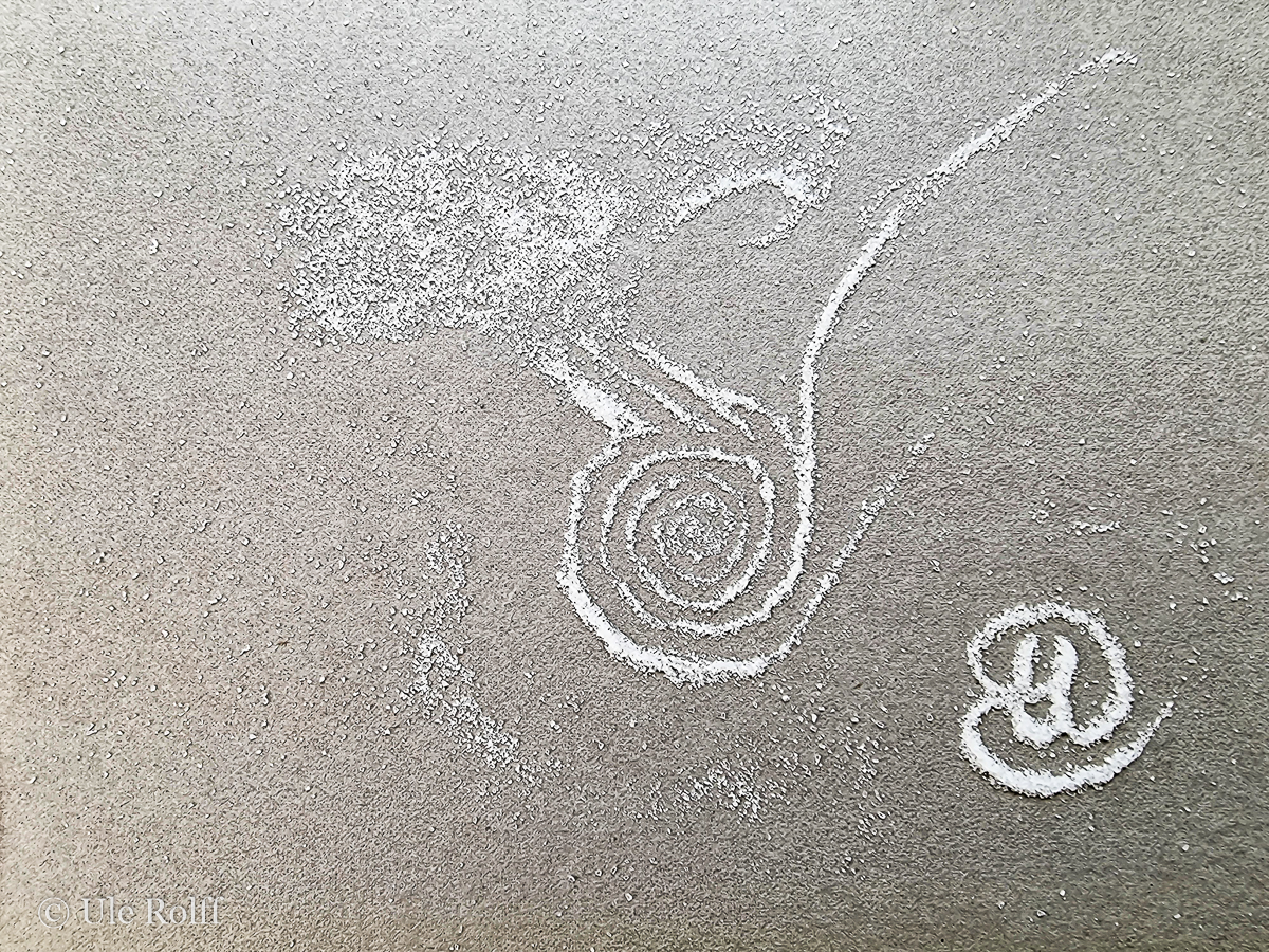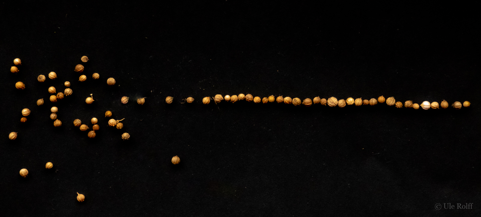 - entweder die Reihung vieler Punkte, die eine Linie ergeben (hier Koriandersamen aus dem Garten oder kurvige Salzkrümel):