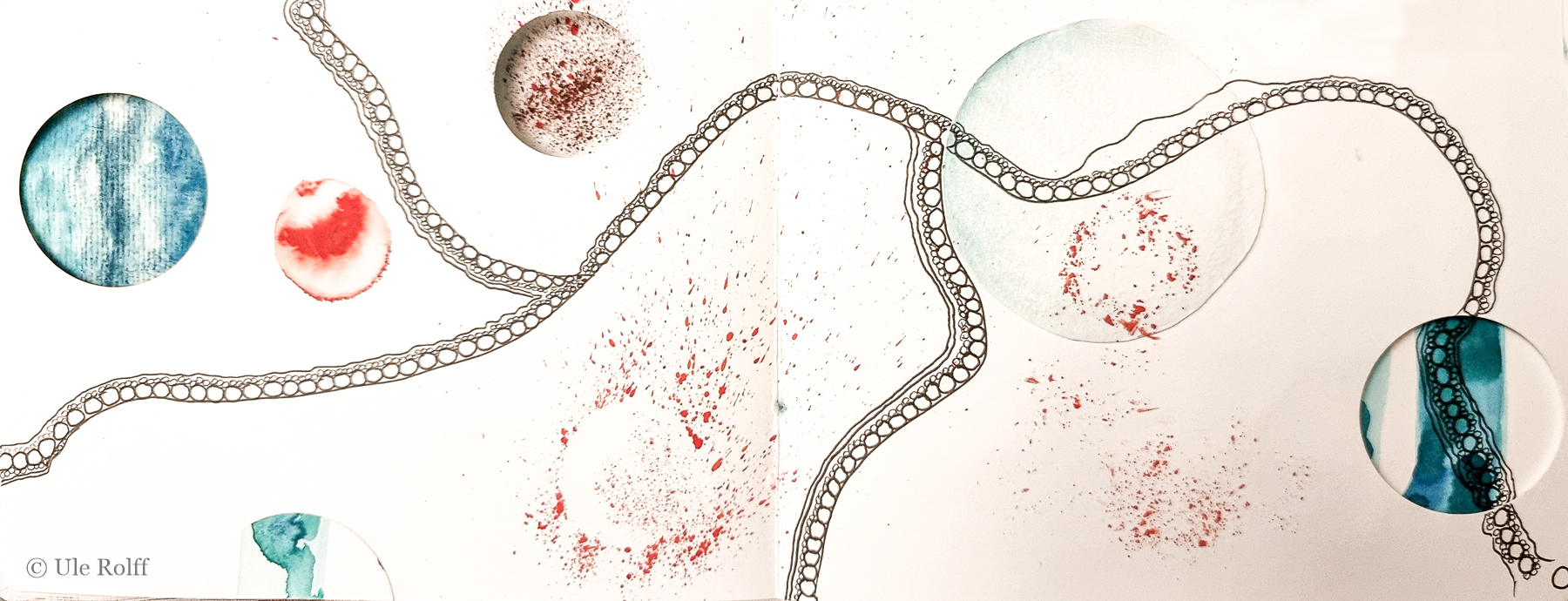 The last piece is a double page from a sketchbook which I have been ‚working‘ on (‚playing‘ would be more suitable). I’m still recurring to it when an idea appears of something to add or alter, so it is on progress, not finished if ever.