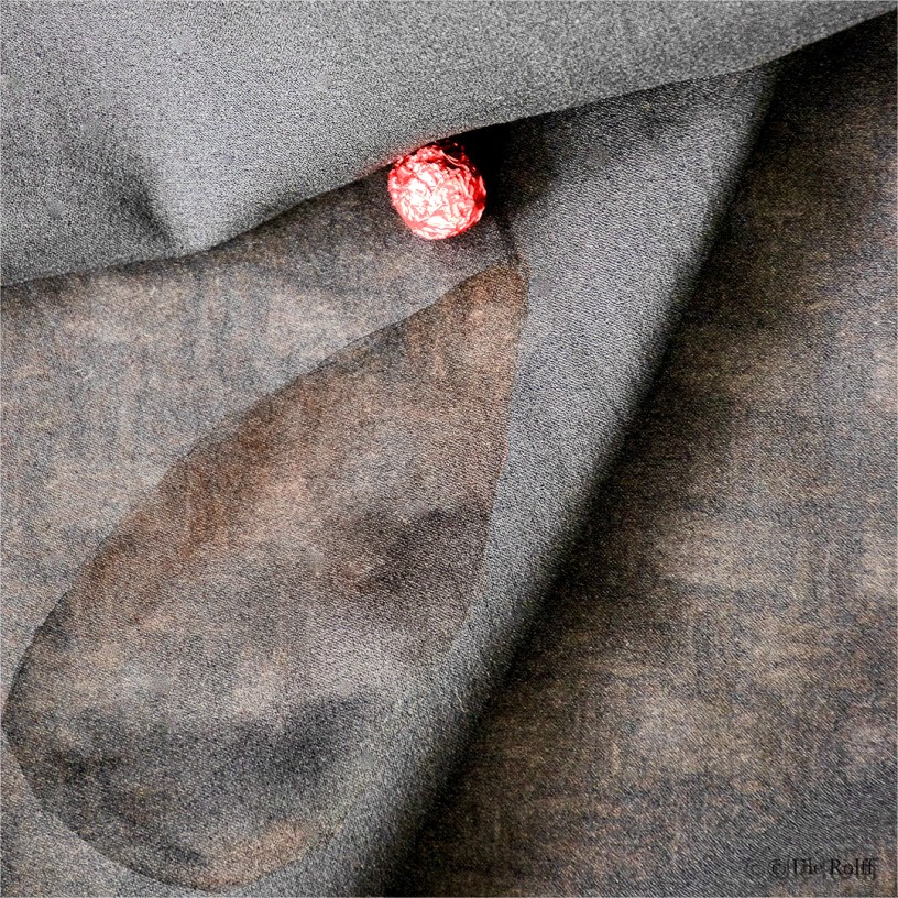 Das ist kein Handtuch, ich habe ein Bild mit Faltenwurf aus dem Archiv gesucht und anschließend ein Aquarell mit Brandspuren in Bügeleisenform gemalt, fotografiert und mit dem Tuch in Photoshop überlagert.