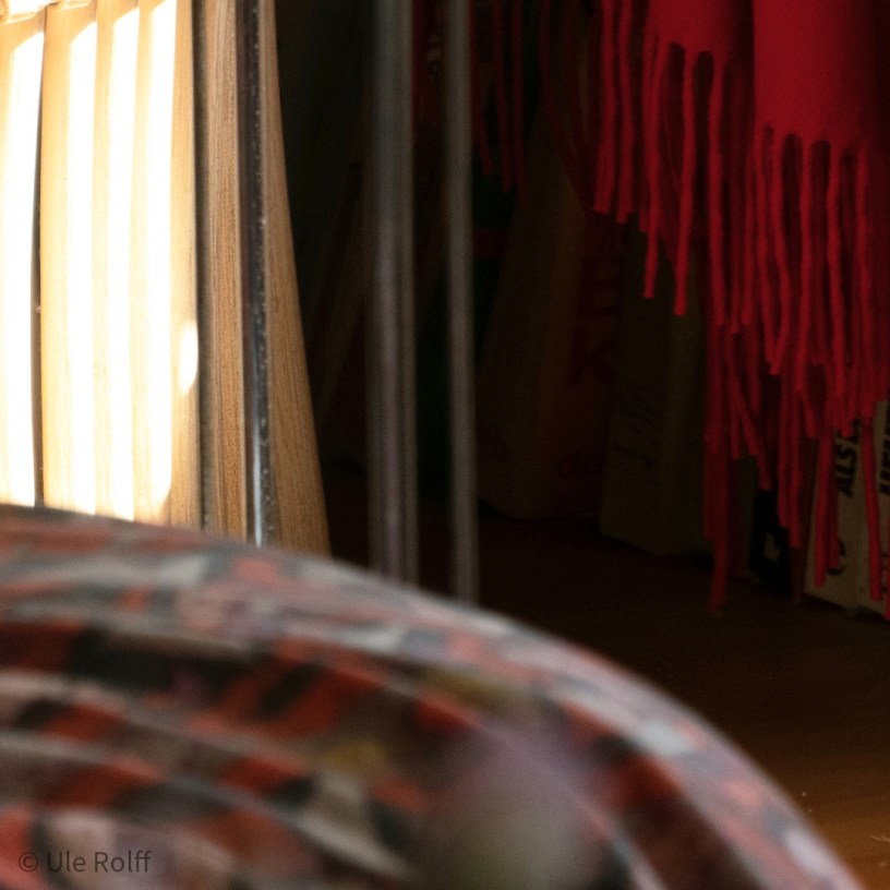 Auf der rechten Seite scheint mir ein roter gefranster Schal entgegenzuleuchten. Deutet der vielleicht auf seine wachsende Bedeutung beim zukünftigen Draußen-Sein hin?