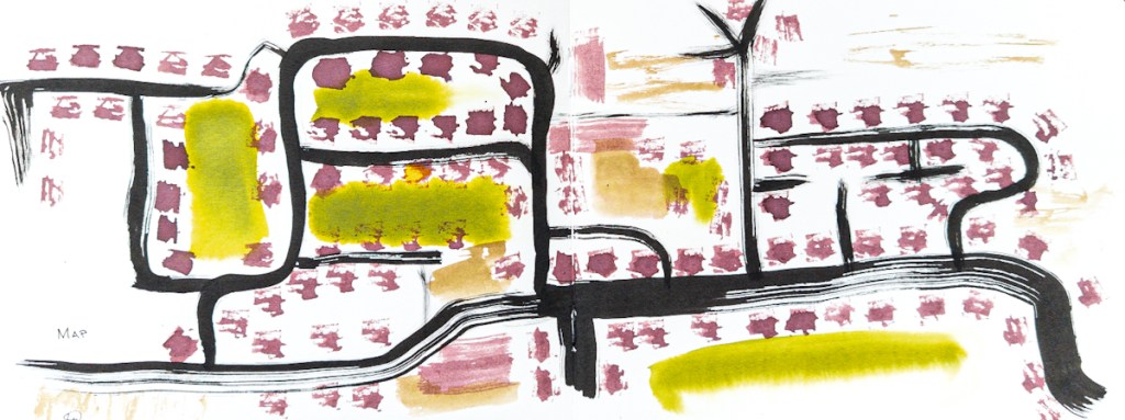 Oder meinst du die größeren Flächen in gelbliche Grün/ grünlichem Gelb? Das ist eine Schreibtinte in „saharagrün“, Hausmarke meines Lieblingsschreibwarenhändlers in Münster. Mit Schreibtinten mag ich gerne Skizzen ganz lose ein bisschen kolorieren.