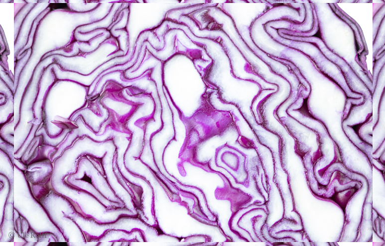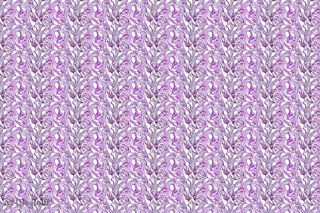 Dies wird euch vertraut erscheinen: ein etwas wildes Tapetenmuster, das ich 2019 aus dem Makrofoto eines aufgeschnittenen Rotkohls generiert habe. Was habe ich heute nach dem Ausgangsfoto gesucht, um euch die Basiseinheit des Musters, also das Originalfoto, zu zeigen! Es ist nicht da, einfach weg. Wahrscheinlich habe ich damals einfach das Origialfoto zu dem Muster verwurstet, womit es nach dem Schließen der Datei unwiederbringlich verloren war.
