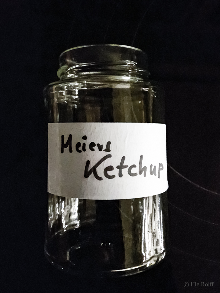 Dieses Foto diente vor sieben Jahren dazu, eben jenem Meier auf dem Etikett zu zeigen, dass wir sein köstliches, hausgemachtes Ketchup innerhalb kürzester Zeit verzehrt hatten, ihm noch einmal für diese Kostbarkeit zu danken – und insgeheim der Hoffnung auf Nachschub. Letzteres hat nicht geklappt. Was bleibt, ist die Erinnerung an den Unterschied zwischen Ketchup und Ketchup und ein Foto.