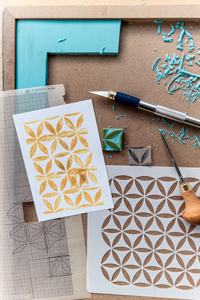 und das Bild zeigt fast alle Arbeitsschritte in einem Foto bis zur ersten Probe. Nach und nach soll ein Stempelbuch entstehen, aber das kann dauern.